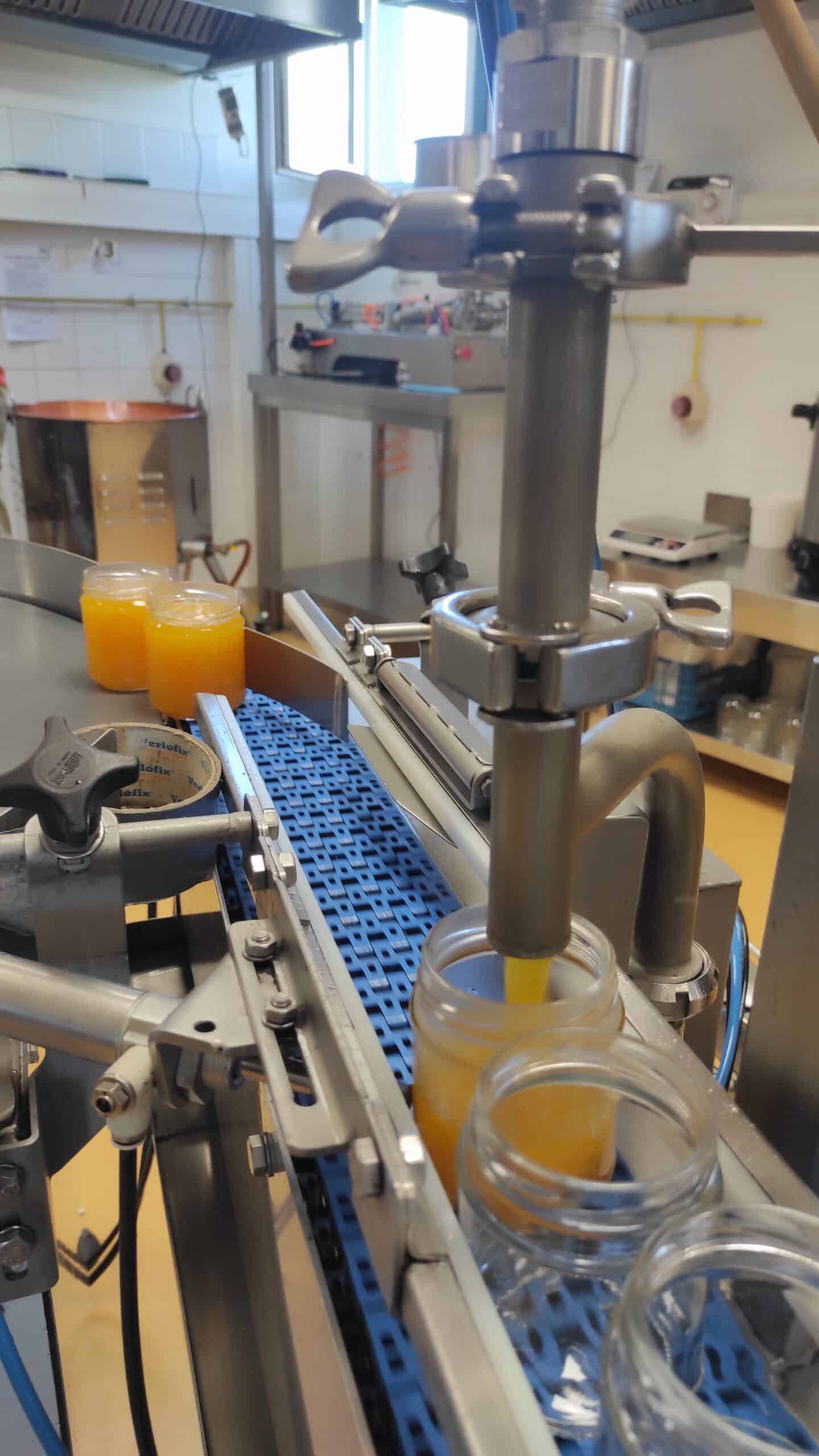 Le mélange est ensuite versé dans une remplisseuse puis les pots sont fermés par une capsuleuse à vapeur.